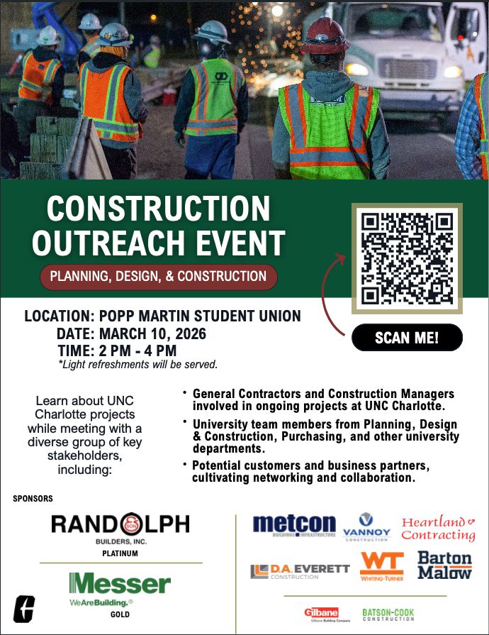 UNC Charlotte is happy to welcome you to our Construction Outreach Event 2026! Join us on March 10th for this prime networking opportunity. Meet face-to-face with leading Construction Management firms, General Contractors, and engage directly with UNC Charlotte’s Planning, Design & Construction (PDC) and Engineering teams. You will learn about upcoming opportunities, discuss the project pipeline, and build the crucial relationships that drive new business.